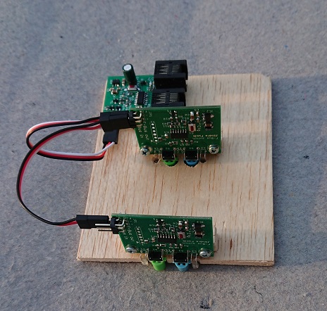 Assembly and connectionModules are designed for direct mount to the panel, without requirements of additional wires connecting module and buttons. Buttons are integral part of module. Module is mounted to back side of panel, using holders in shape of upside down letter "L", or for example wooden blocks, as presented on attached images.The buttons using colour fingerboards. I'm using fingerboards Zippy 2P1-2TB, that are available in various colours and shapes. Those fingerboards can be putted directly to buttons. Once you must place buttons under thick material, then it is possible to glue fingerboard to button using super glue or underlay fingerboards on top of buttons by piece of plastic insulation. Mechanical part of mounting has to be done with focus to visual look. Because devices are mechanically compact, then it is possible to have many of variants, and everybody can have own variant. Once modules are mounted on place, it is necessary to connect them properly. It is also not complicated. Modules are connected using three-wire cables. Those cables are well known in modellers community as servo connection cables. This three-wire connection is marked as F-Bus. Each module is usually equipped by two headers. One header is for input, second one is for output to the next module. But they are connected in parallel, then it make no sense what one is input and what one is output. Once it is necessary to connect more modules to one output, it is no problem. Simple splitter (or "Y cable" for servos) can be used for this kind of connection. Only one fact has to be on mind - splitted lines can not connect on other place and can not make circle or ring. Here is possible to use only in line, tree or star topology. On begin of line (in centre of star) has to be module, that manage connect to XpressNet command station. It is module without controlling buttons, but with big black modular connectors for cable connection. Here are also two those modular (telephone) connectors. They are also equivalent. One as a input and second as output for connection next throttle or controller. Only one convertor for each panel can be used, it has to be placed at the begin of three-wire cable. When connecting, then connect this module as first, make its configuration and then connect connect and configure rest of modules. |