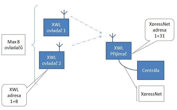 Rodina bezdrátových DCC ovladačů XWLV minulosti jsem vytvořil několik ovladačů, založených na protokolu XWL, který vytvořil Paco Cañada.Zjistil jsem, že si celá řada lidi nedokáže zařadit k čemu jsou jednotlivé ovladače vhodné a jak je kombinovat. Proto se pokusím vytvořit dokument, který by popisoval princip fungování. Všechny ovladače jsou založené na jednotném přijímači. Přijímač se připojuje k XpressNet sběrnici (Pro uživatele Roco do zásuvky slave, pro uživatele Lenz svorky LMAB). Jako každé XpressNet zařízení musí dostat přidělenou unikátní adresu, ta se nastavuje jednoduše pomocí přepínačů na desce přijímače. Jeden přijímač dokáže obsloužit až 8 ovladačů, je celkem jedno, jaké ovladače a v jakých kombinacích. Každý ovladač má možnost nastavení své unikátní adresy. Tato adresa nemá nic společného s XpressNet adresou přijímače ani například s adresou lokomotivy. |